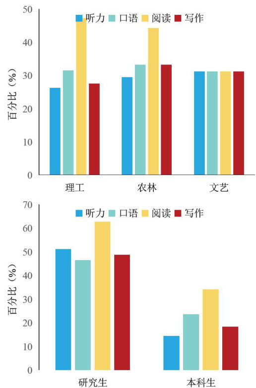 [摘要]采用问卷调查法探究不同专业及学历层次学生的英语学习动机、方式及成效的差异。结果表明:(1)学习动机以学业和求职导向为主。其中,农林类学生学业动机突出,理工科学生更关注求职,而人文类学生兴趣驱动相对显著。(2)学习方式依赖传统词汇、语法训练,实践活动参与不足。其中,农林类学生更倾向传统方法且学习决心更强,研究生自主性较高但实践活动参与仍有限。(3)学习成效上,阅读能力最优,口语与听力最弱,应试导向特征明显。其中,理工科阅读能力占优,人文类听写能力相对突出;研究生“听说读写”四项技能得分均显著高于本科生。研究揭示了学科属性与学历层次对英语学习的差异化影响,为优化分层次、跨专业教学策略提供实证依据。