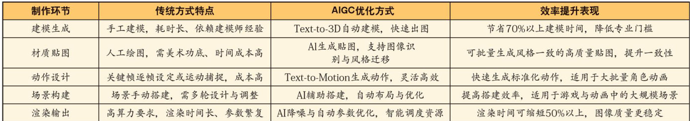 [摘要]当前,我国三维动画产业对效率与创意表达的双重需求不断增长,人工智能生成内容 (AIGC)技术正成为推动动画制作流程革新的关键力量。本文围绕AIGC技术在三维动画各核心环节中的应用展开研究,重点分析其在建模、贴图、动画生成与渲染优化等方面的实际作用与表现。同时,文章从“流程优化”与“创意突破”两个维度出发,探讨AIGC如何应对传统动画制作中存在的高技术门槛、周期冗长及内容同质化等挑战。AIGC能显著提升动画资产生成与渲染效率,还能以文本驱动方式支持个性化创作与风格迁移,在动画工业化生产与艺术创意融合方面的发展潜力,其将成为推动三维动画智能化、标准化及多元化发展的重要引擎。