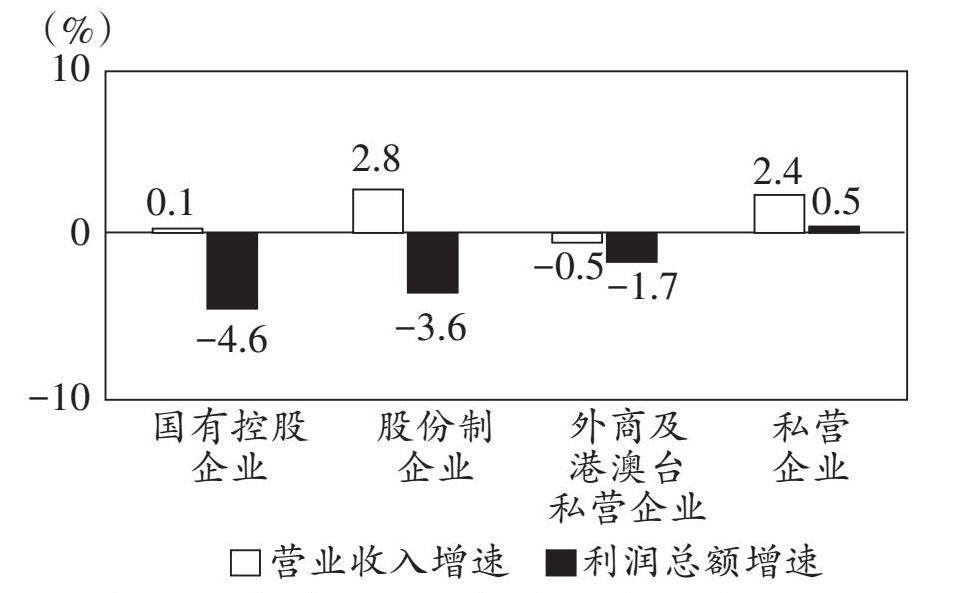 一、单项选择题 1. 2025年1月27日,国家统计局发布数据显示,2024年全国规模以上工业企业实现利润总额74310.5亿元,比2023年下降3.3%。下图为各经济类型的营业收入及利润增速情况: 据此可推断,2024年我国( ) ①混合所有制改革成效凸显,国企控制力增强 ②国有控股与股份制企业存在降本增效的压力 ③外商投资以及私营企业处于普遍亏损的状态 ④内需相对不足,全国工业利